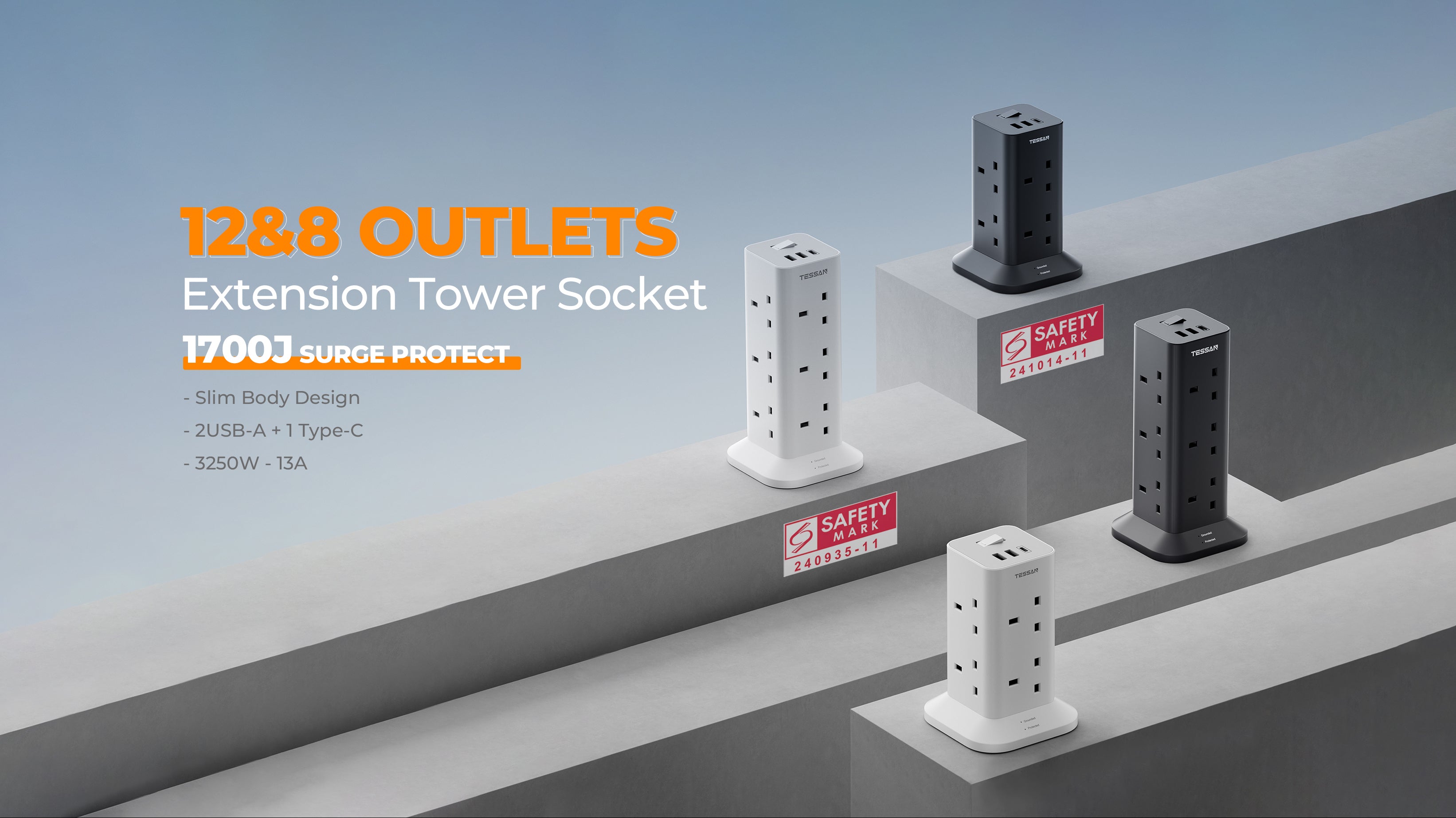 TESSAN - Extension Cord Tower 8 Ways Socket Outlet with 2 USB-A & 1 USB-C Ports