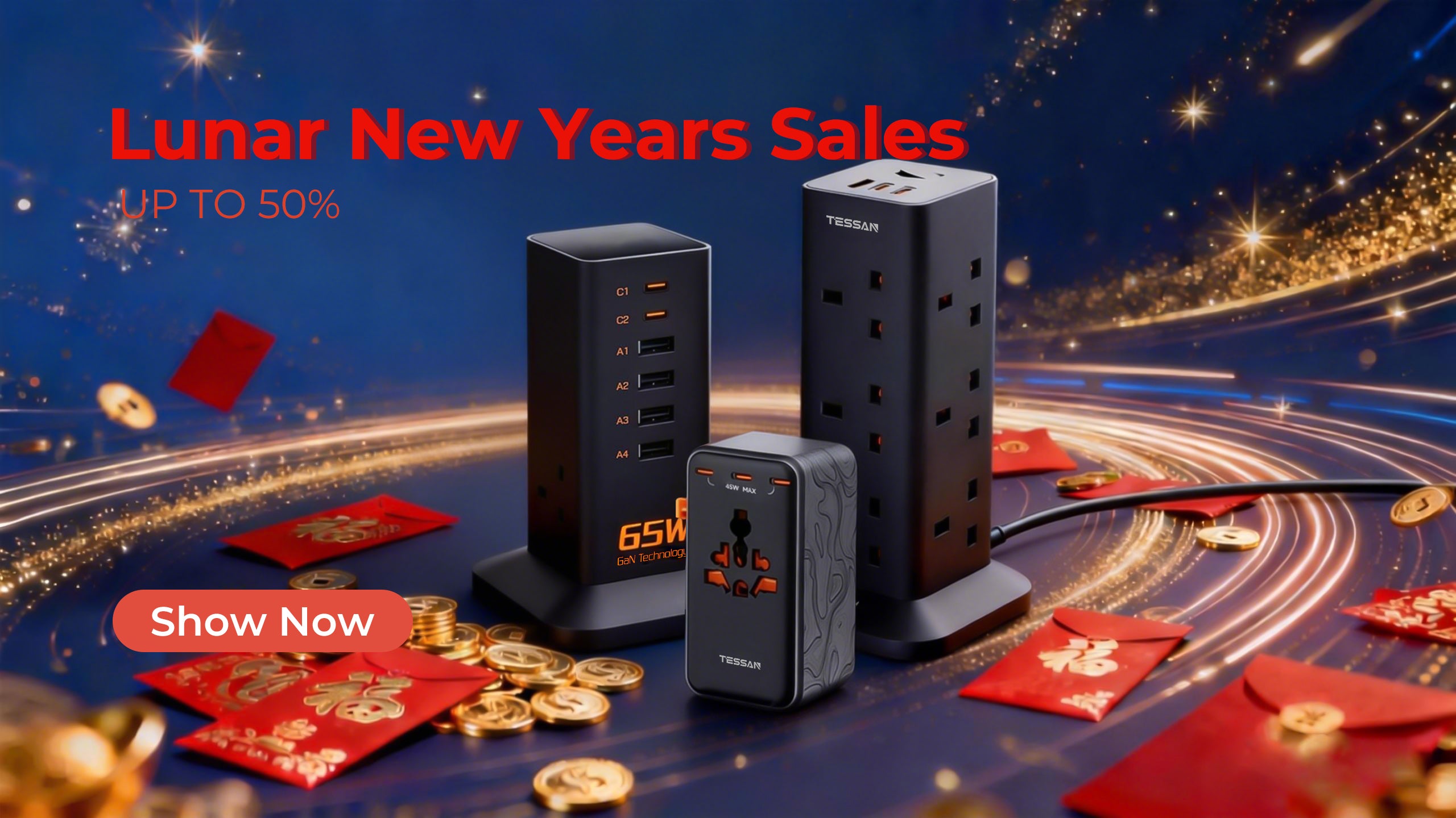 TESSAN - 65W GaN Charger Multiple Extension Cord Extension Tower with USB C Charging Station
