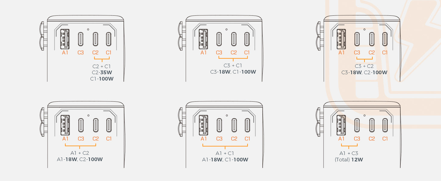 Combined Output ModeUSB-C1+C2:100W+35WUSB-C1+C3:100W+18WUSB-C2+C3:100W+18WUSB-C1+A1:100W+18WUSB-C2+A1:100W+18WUSB-C3+A1:(total)12WUSB-C1+C2+C3:65W+35W+18WUSB-C1+C2+A1:65W+35W+18WUSB-C1+C3+A1:100W+12WUSB-C2+C3+A1:100W+12WUSB-C1+C2+C3+A1:65W+35W+12W