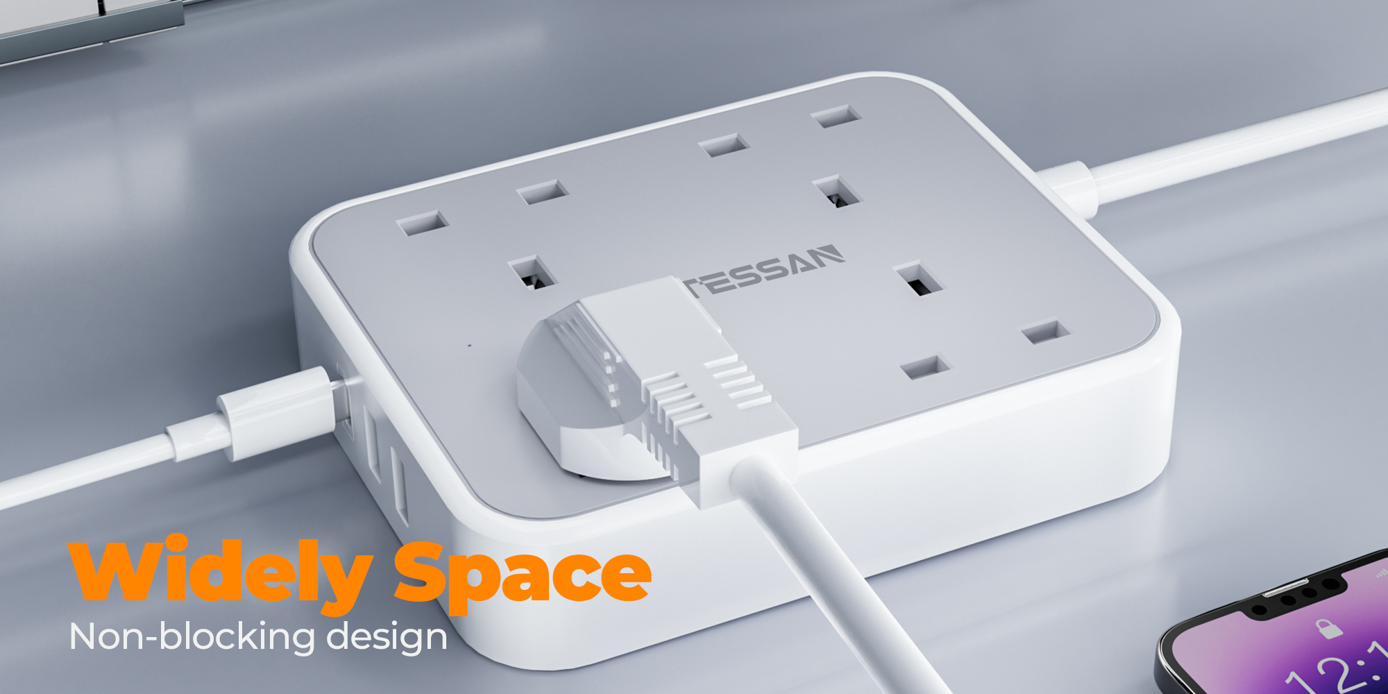 There are 4 widely space AC outlets. The gap between each AC port is 27 mm, which is suitable for almost all British plugs without blocking each other.