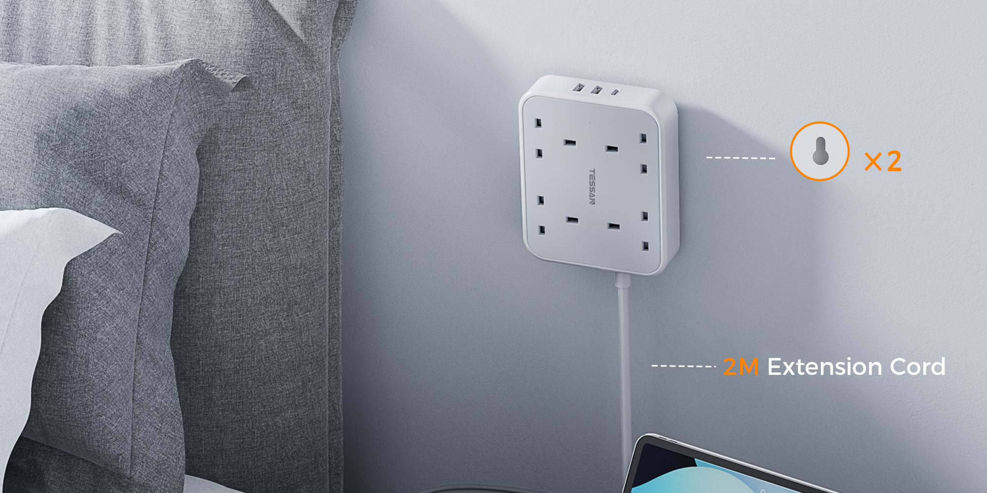 • Extensive Use Extension Plug: The extension cord converts 1 AC outlet to 4 AC and 3 USB ports for multiple uses. Featuring a wall-mountable flat plug design with 2 keyholes, this electric extension lead can be installed on the wall firmly in many different places. The extension cable length 2 metre