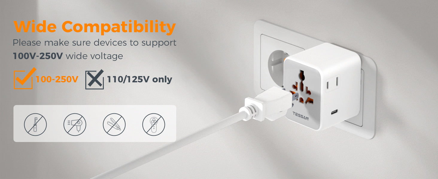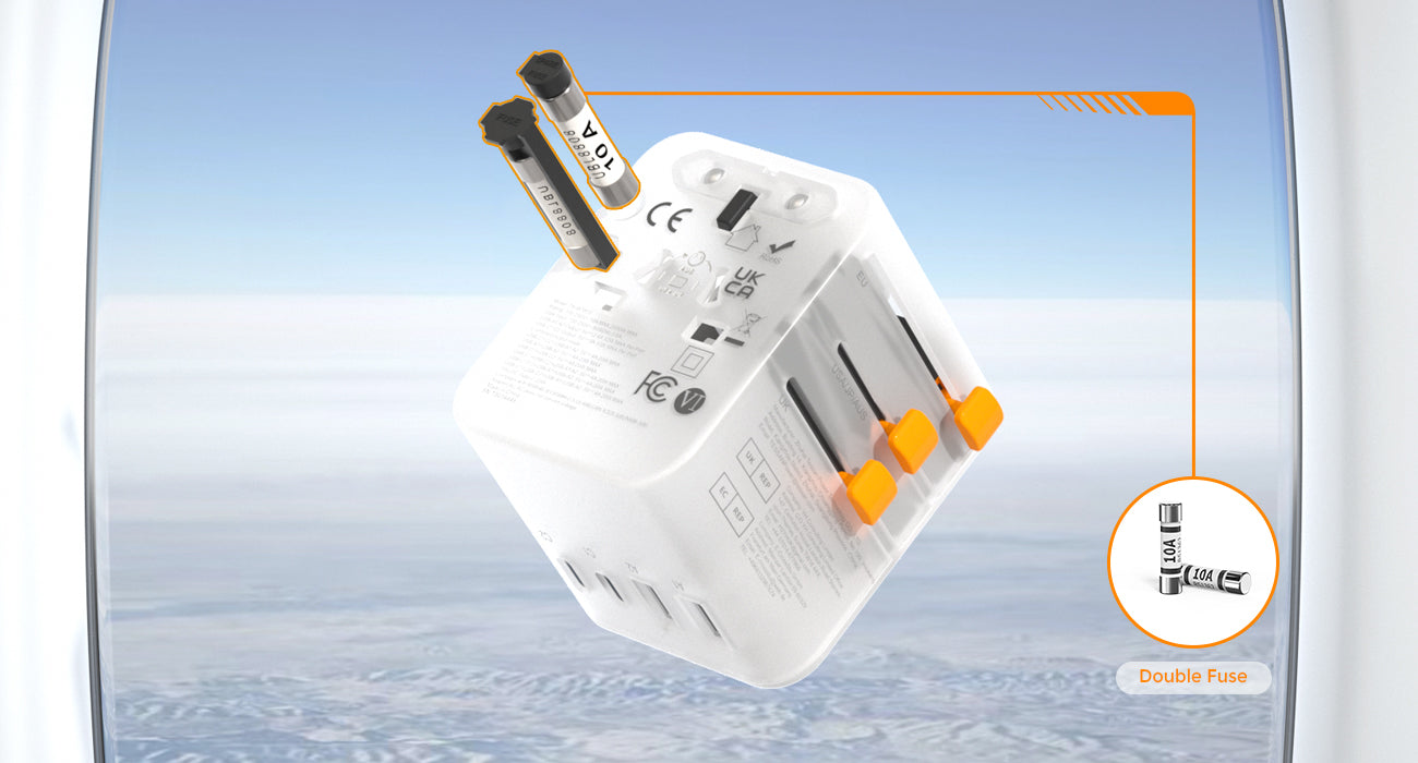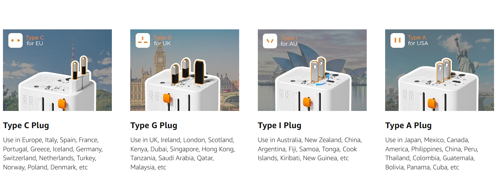Universal Plug Adapter with USB C: Travel plug adapter worldwide features USB C1 C2 C3 (15W MAX per port), quickly charge phone, tablet, and other devices, reducing waiting time; The USB A1 A2 deliver 12W MAX per port and meets your various charging needs