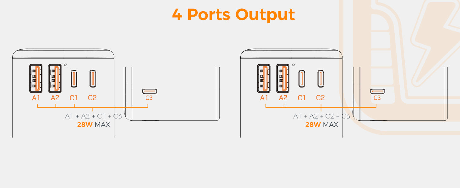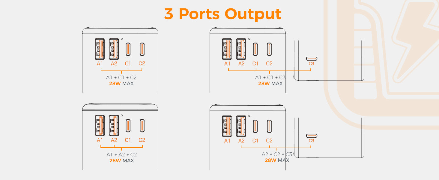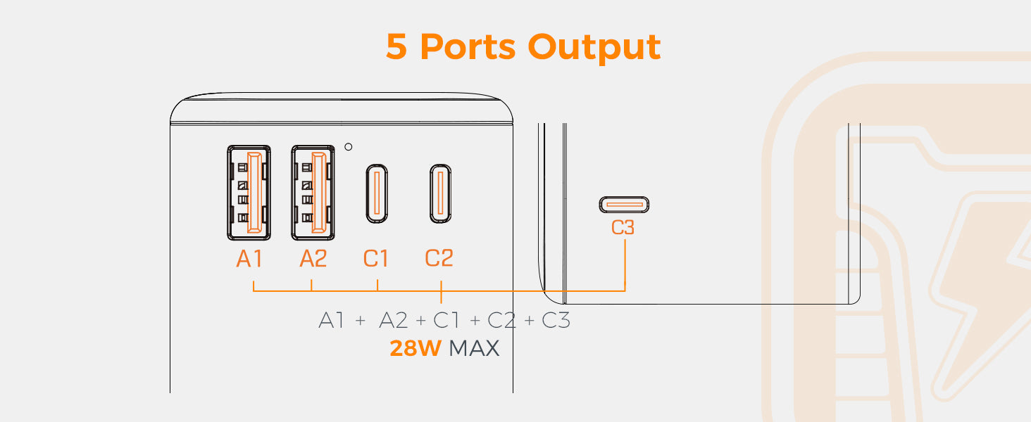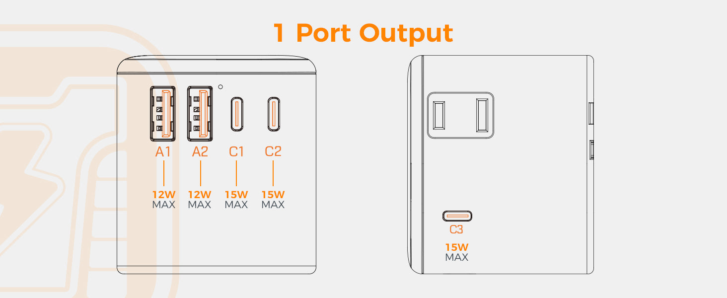 USB-A1/A2:5V/2.4A 12W MAX - Dual USB Output:USB-C1/C2/C3+USB-A1/A2:15W+12W Max