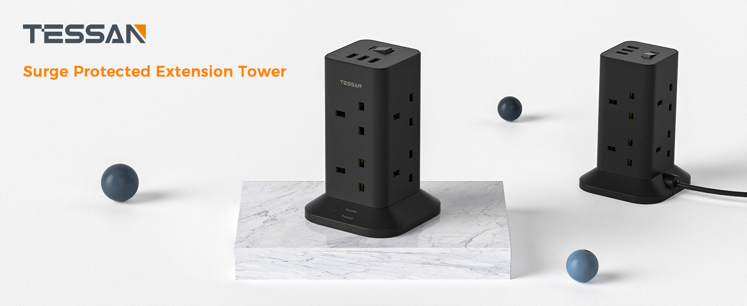 TESSAN - Black Tower 8 Sockets Outlet Plug Extension 3 Meters with 2 USB-A & 1 USB-C Ports