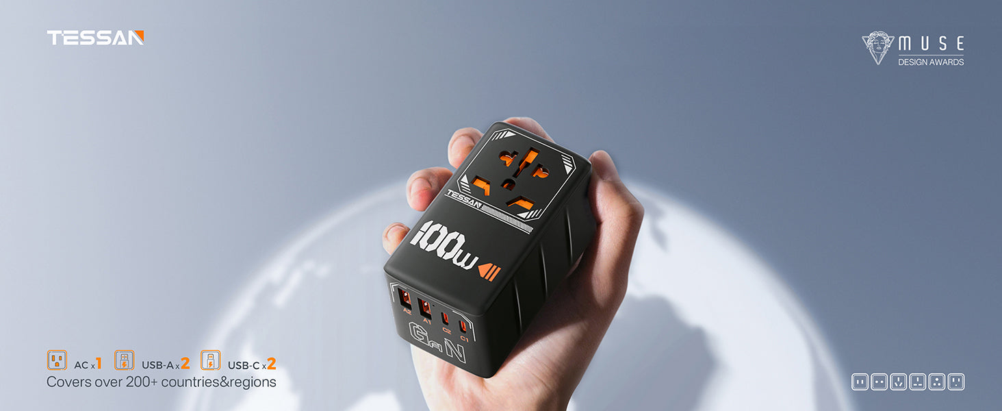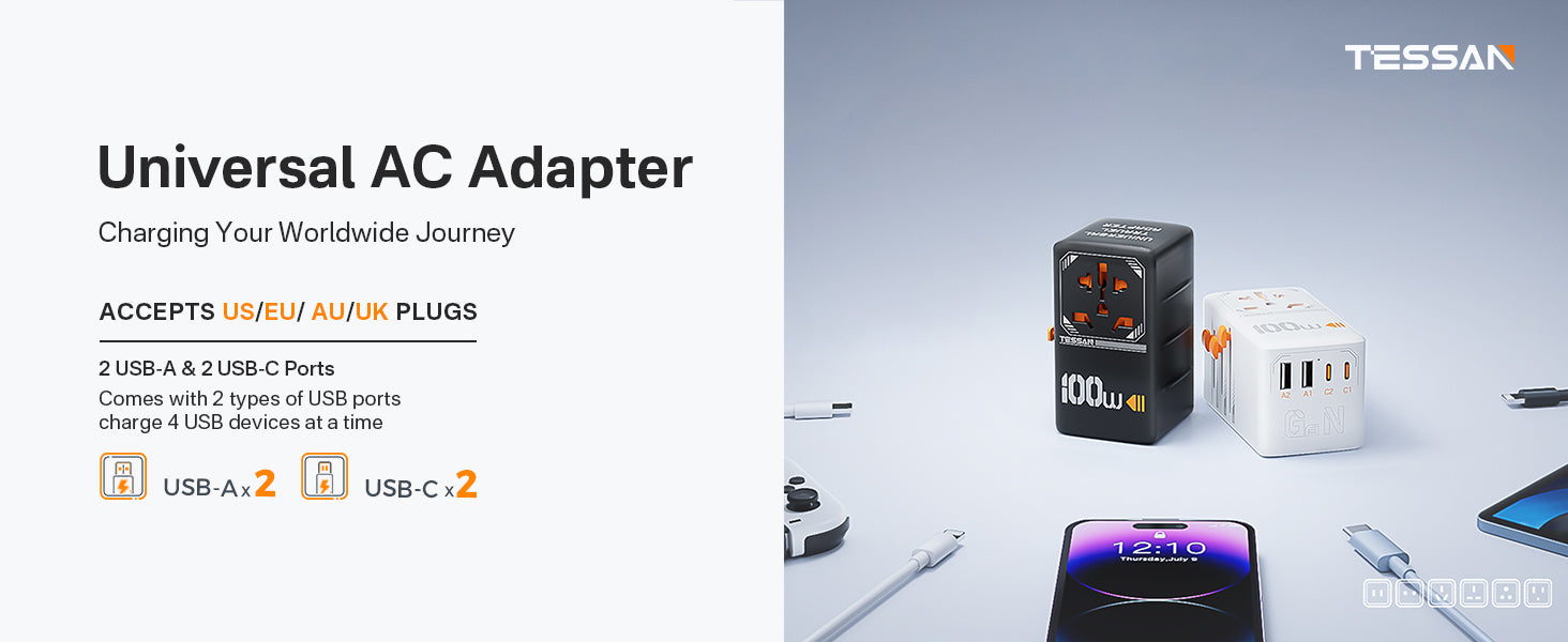 TESSAN - International 100W Fast Charging Adaptor with 2 USB C & 2 USB Charging Ports