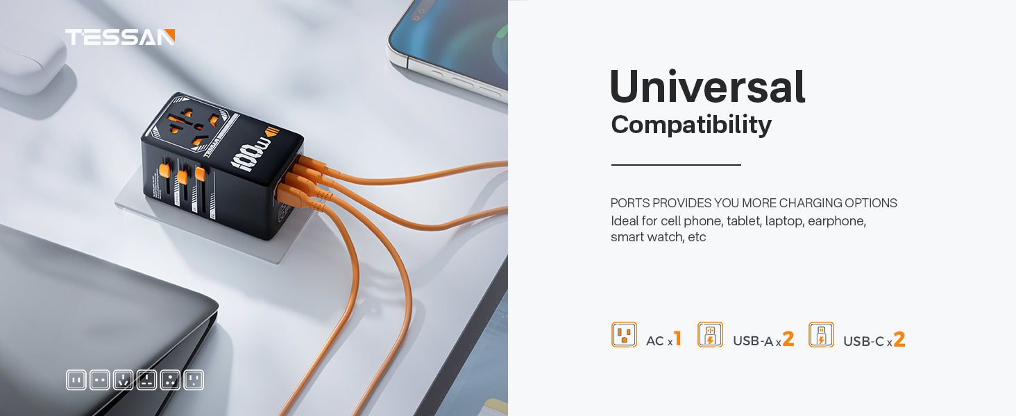 TESSAN International 100W Adaptor is the perfect travel companion for your electronic devices. Its GaN technology allows for efficient and fast charging, while the 2 USB C and 2 USB A ports ensure compatibility with multiple devices. Enjoy a hassle-free experience with this versatile and compact adaptor.