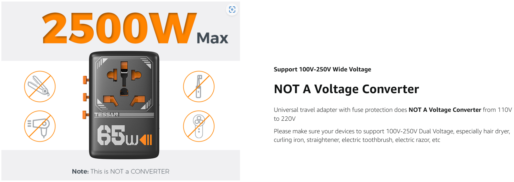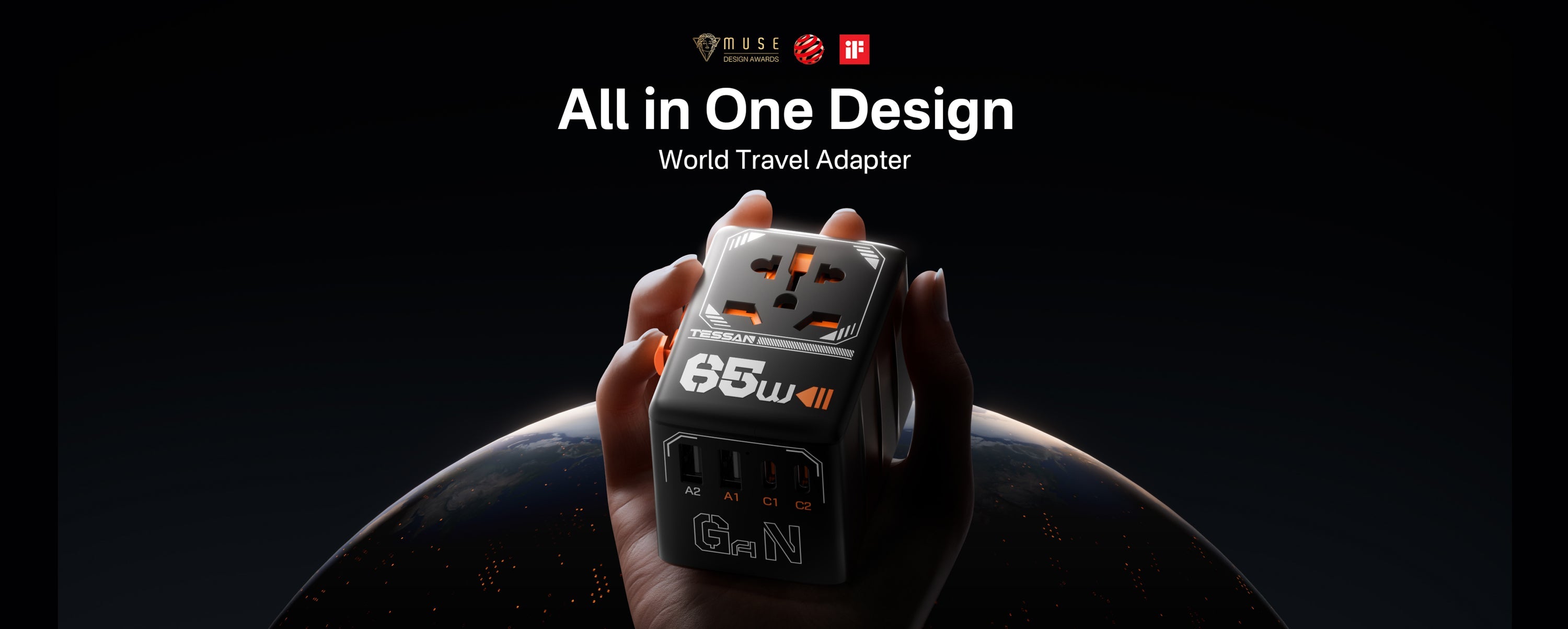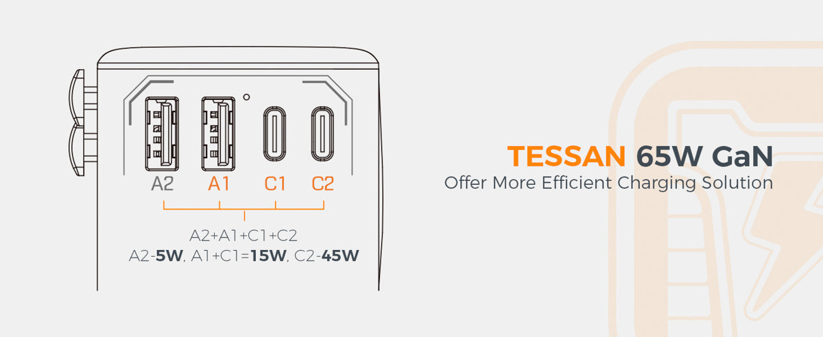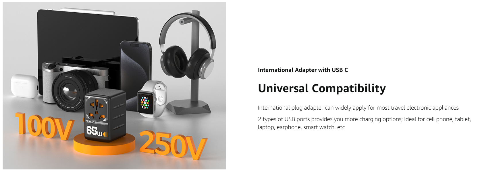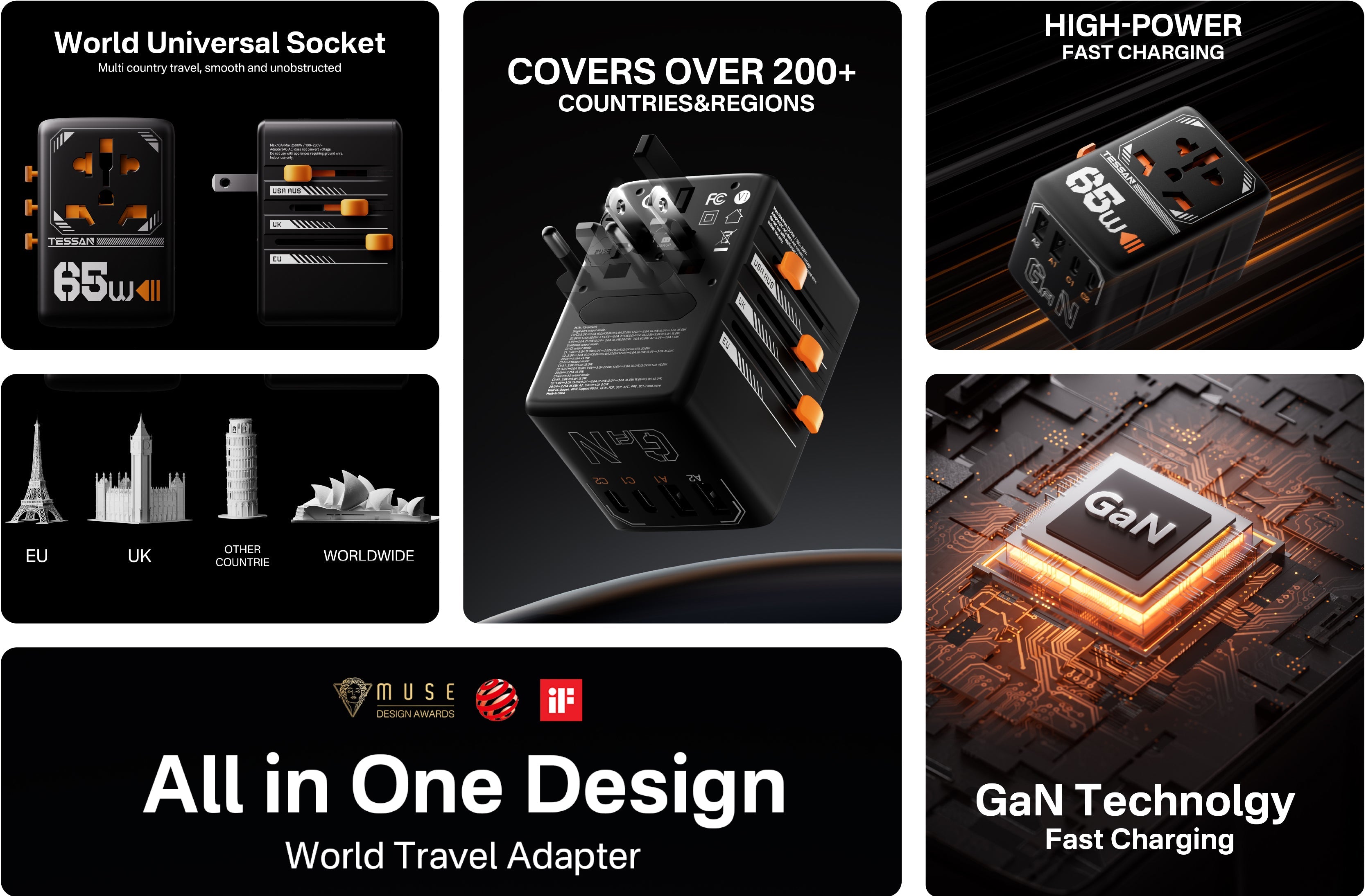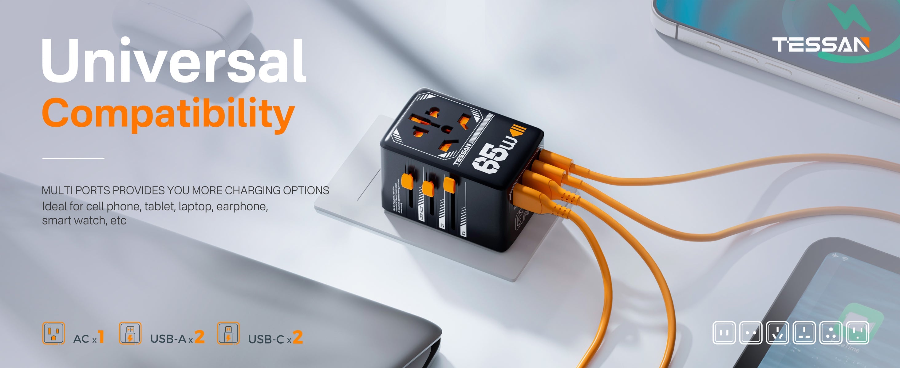 TESSAN universal travel adaptor offers convenient charging capabilities for multiple devices, with 2 USB C and 2 USB A ports. With a power output of 65W, it is suitable for use in the UK, EU, Korea, and Japan... Stay connected while traveling with this versatile and reliable adaptor.